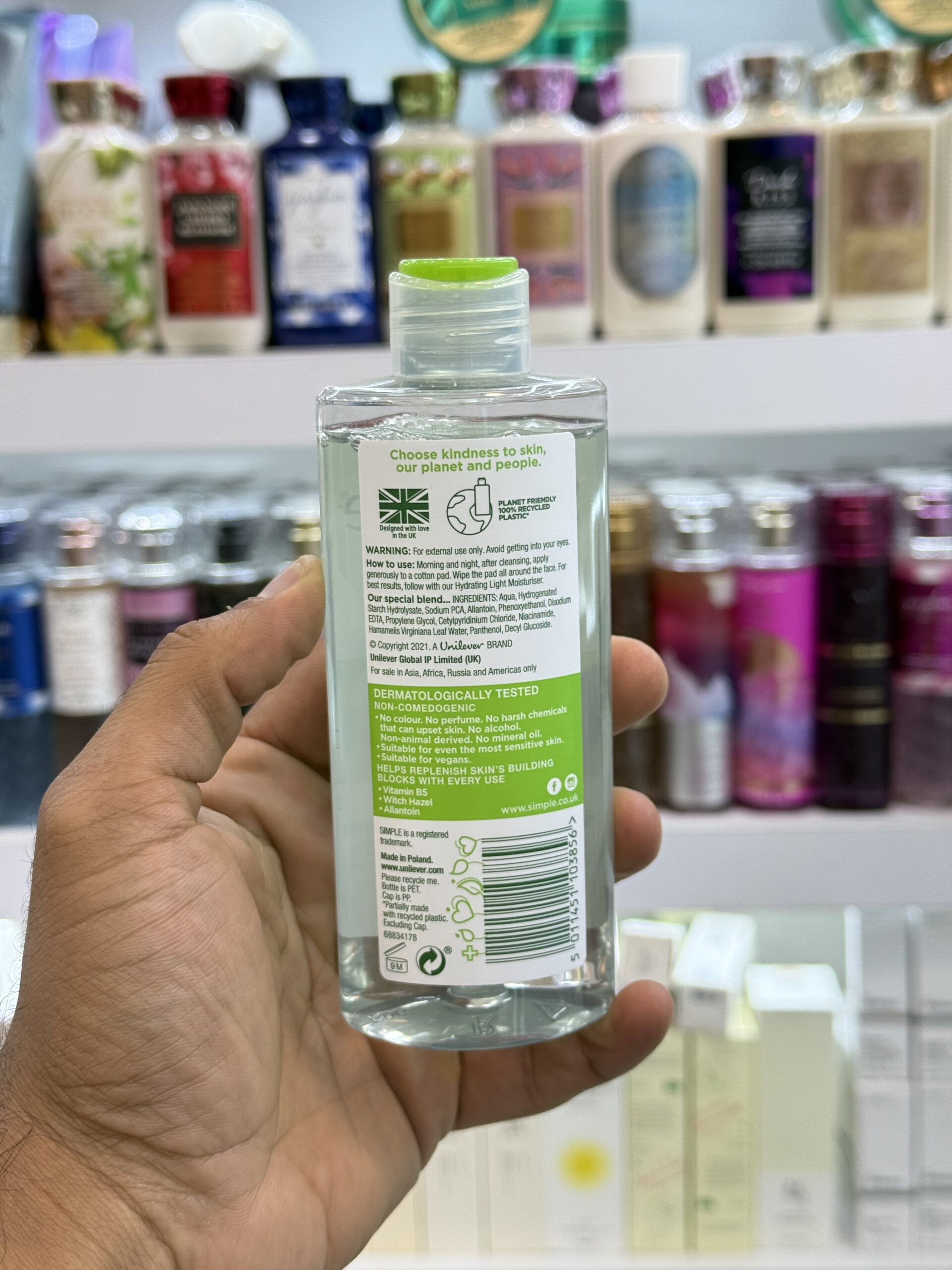 میسلار واتر سیمپل پوست را از آلودگی ها و ناخالصی ها و انواع مواد آرایشی پاک میکند و از باز شدن منافذ پوست جلوگیری می نماید.