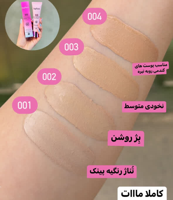 - قابلیت تطابق رنگی: با پخش کرم بی بی تاپ فیس روی پوست، رنگدانههای طبیعی موجود در آن با تونالیته رنگ پوست تطبیق یافته و یکدست میشود.